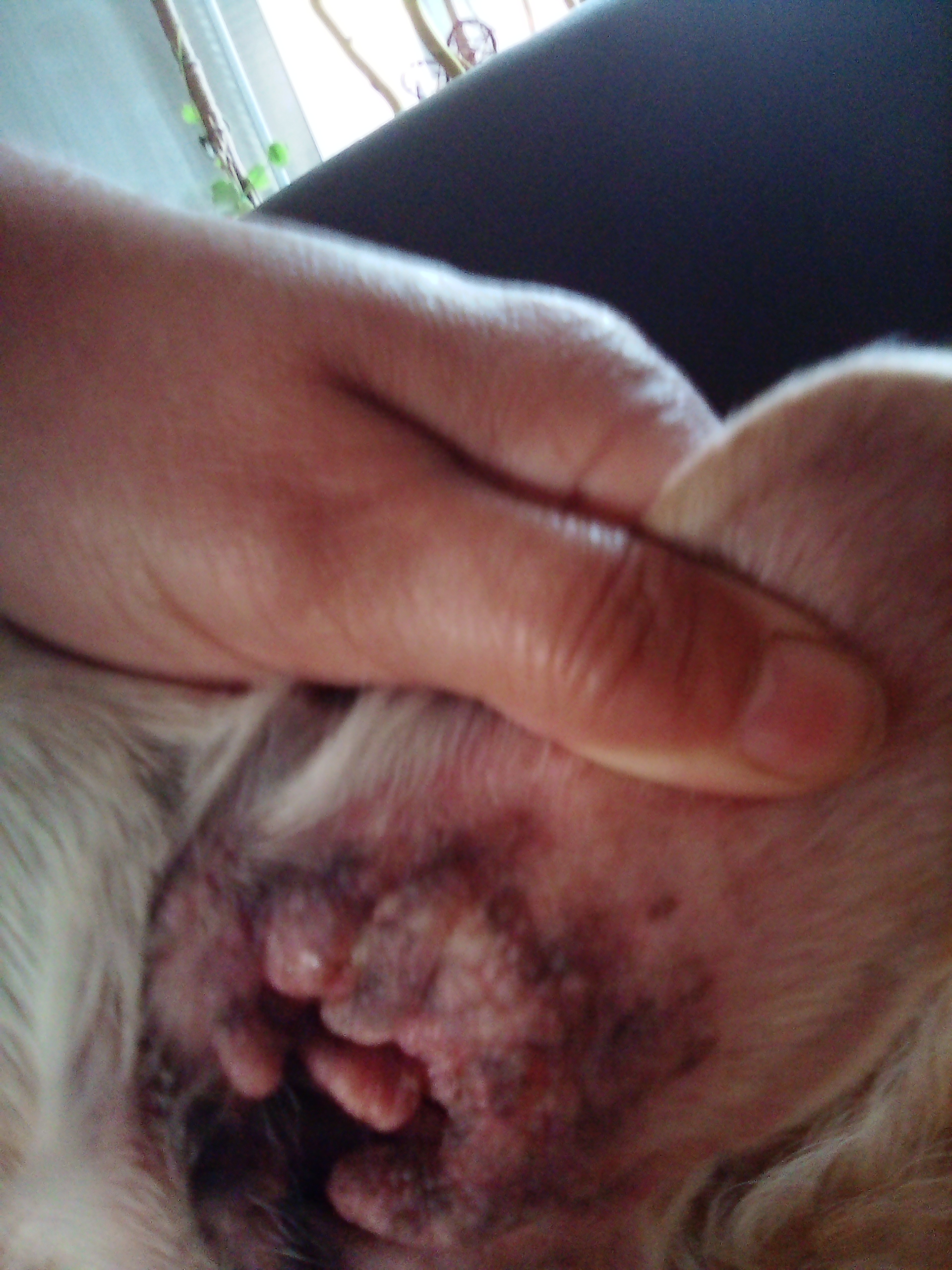 Wenn diese Organe nicht mehr gut arbeiten kann es zu Ausleitungen über die Haut kommen, die schwer zu behandeln sind. Das Bild zeigt ein chronisches Hautbild eines Ohres beim Hund.
